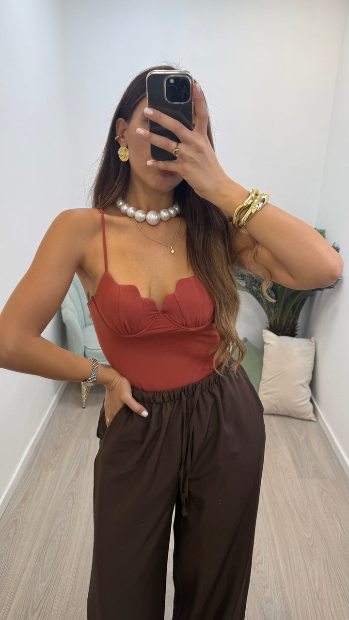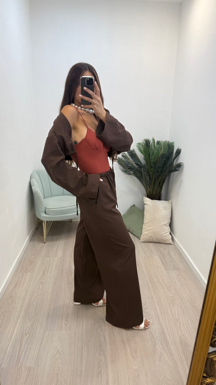 - Il pantalone ha l'elastico in vita ed è modello palazzo