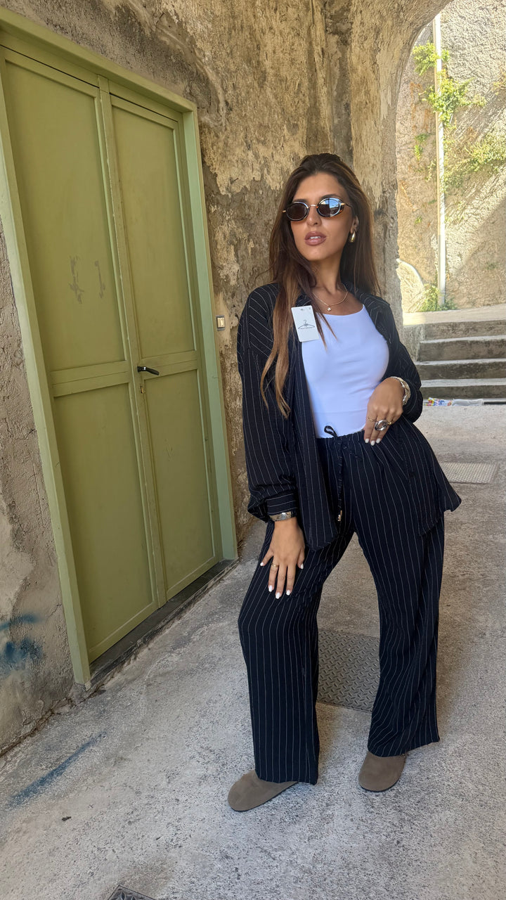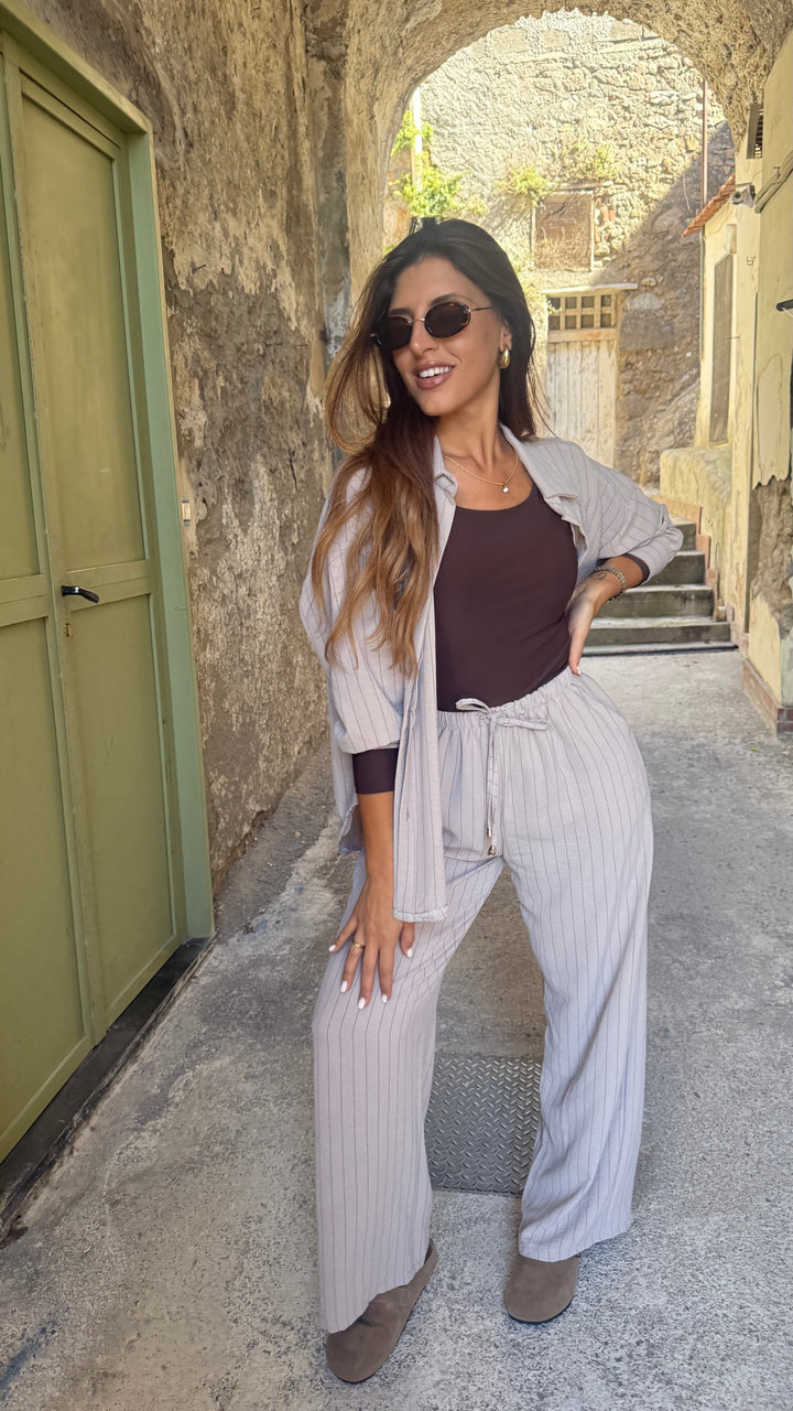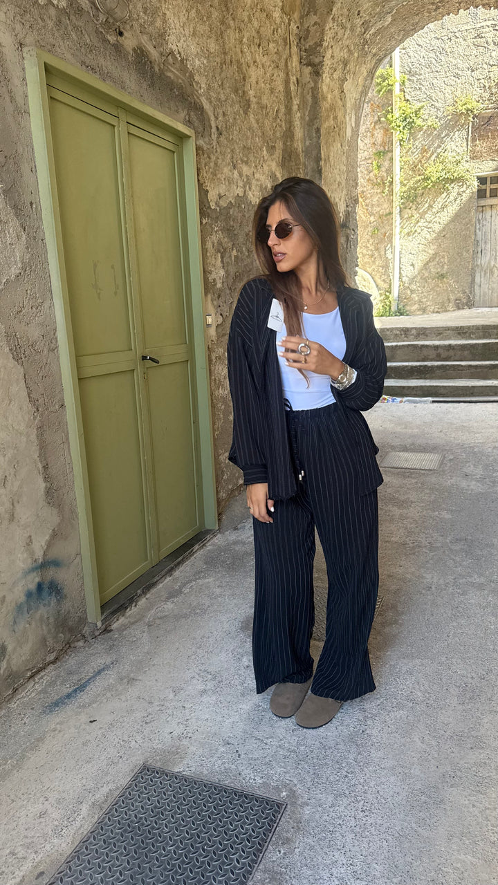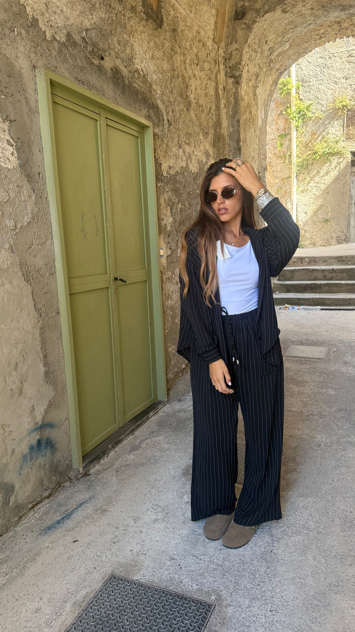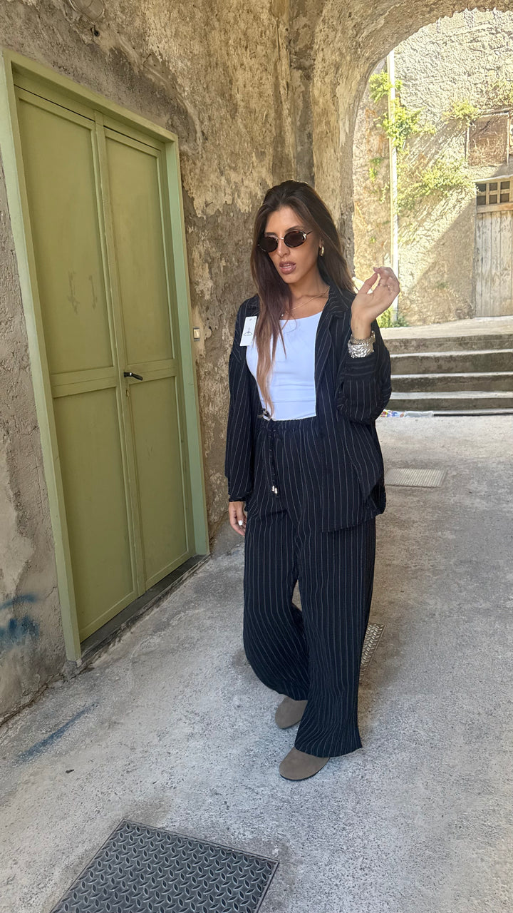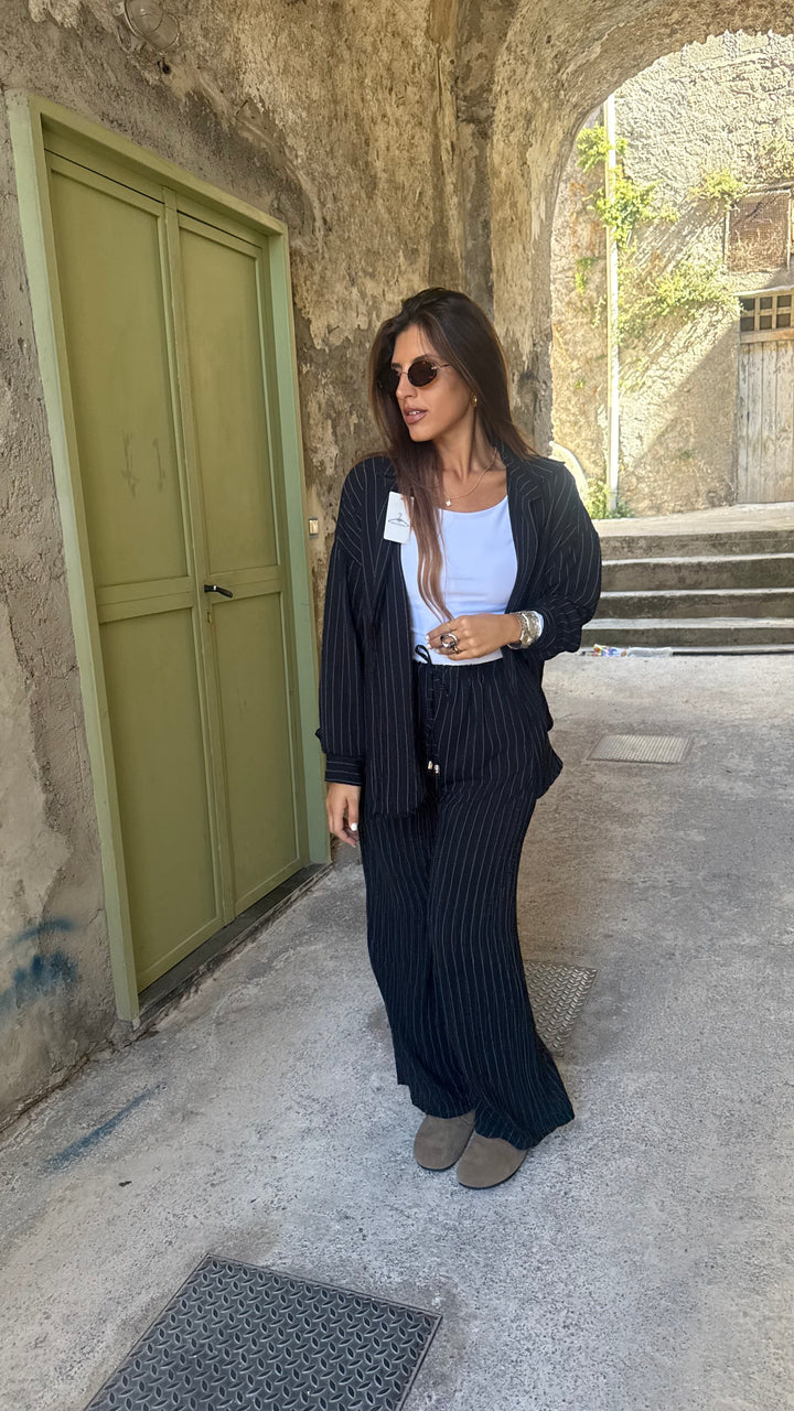 - Il pantalone ha l'elastico in vita ed è un modello palazzo