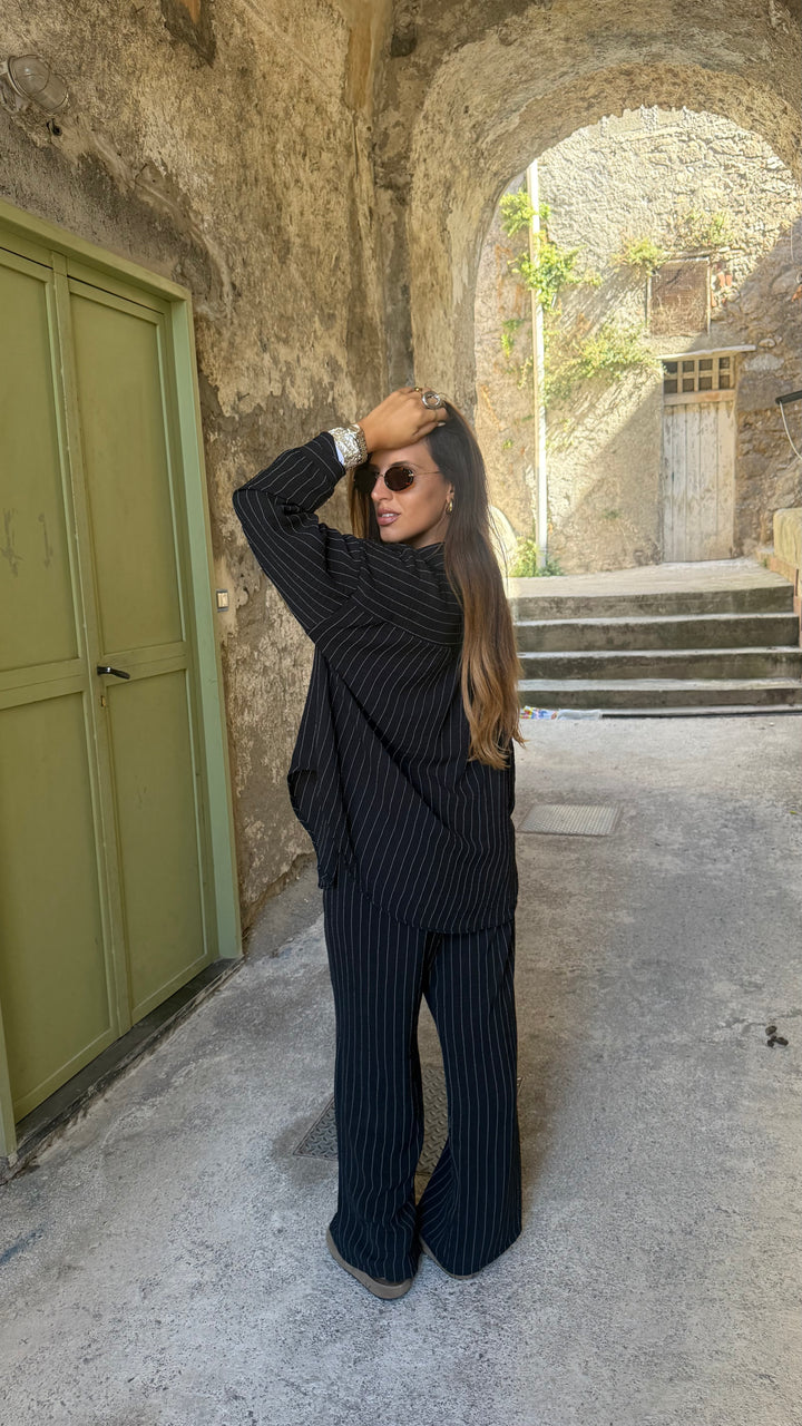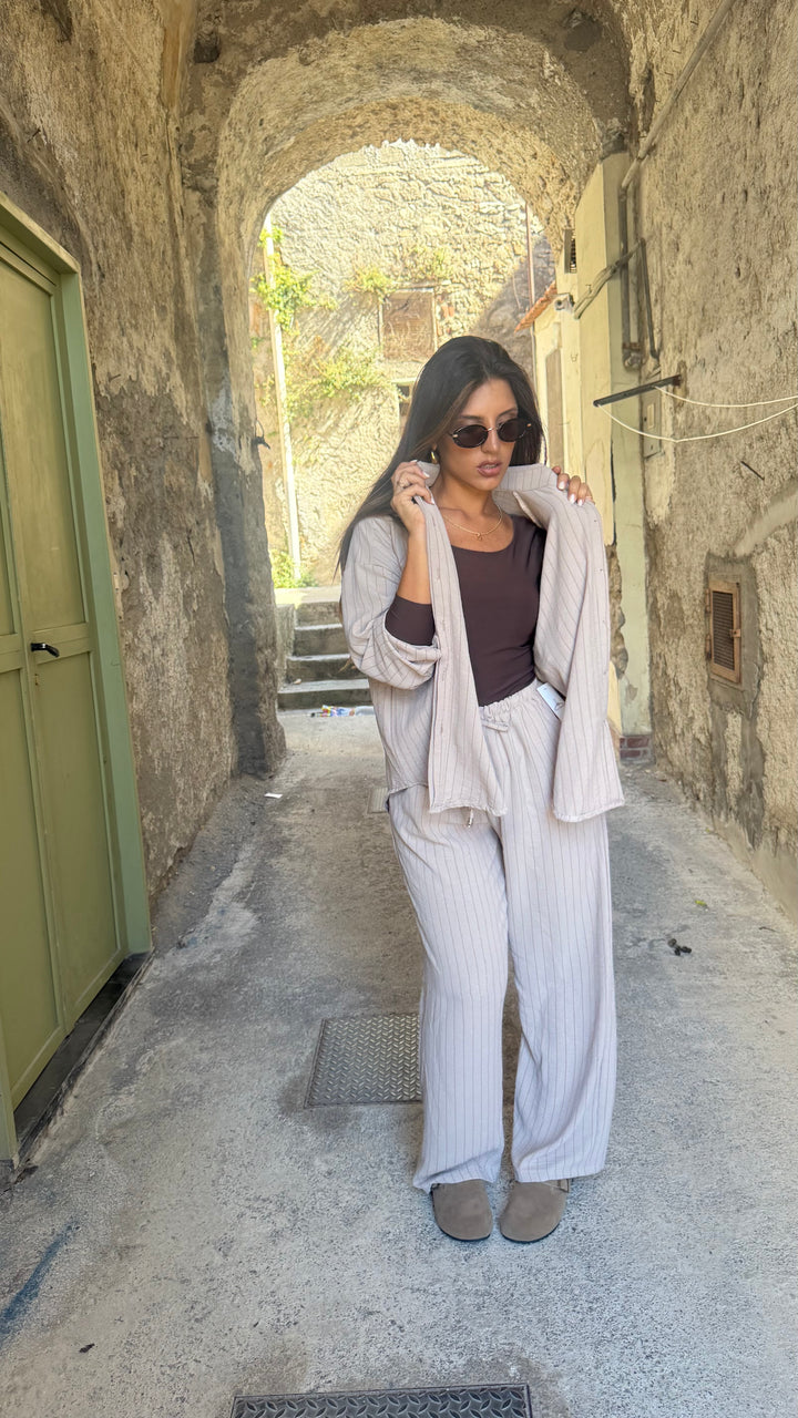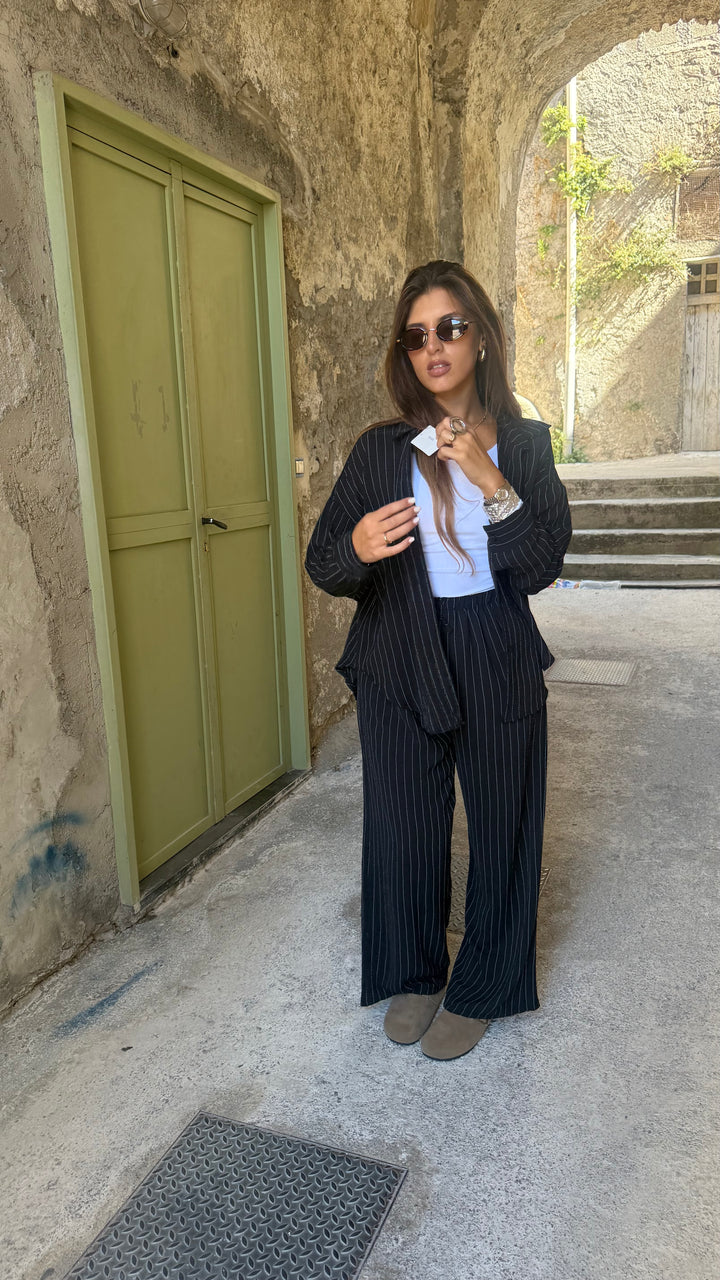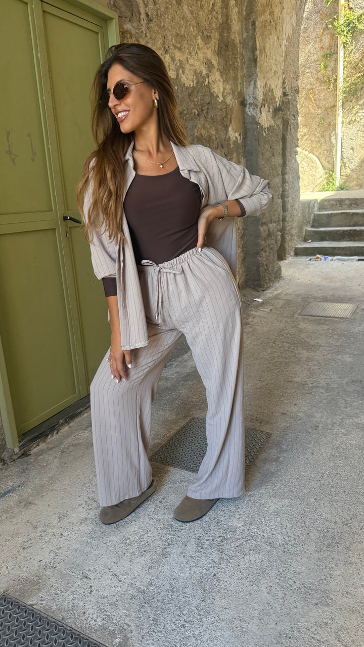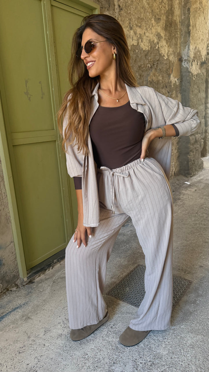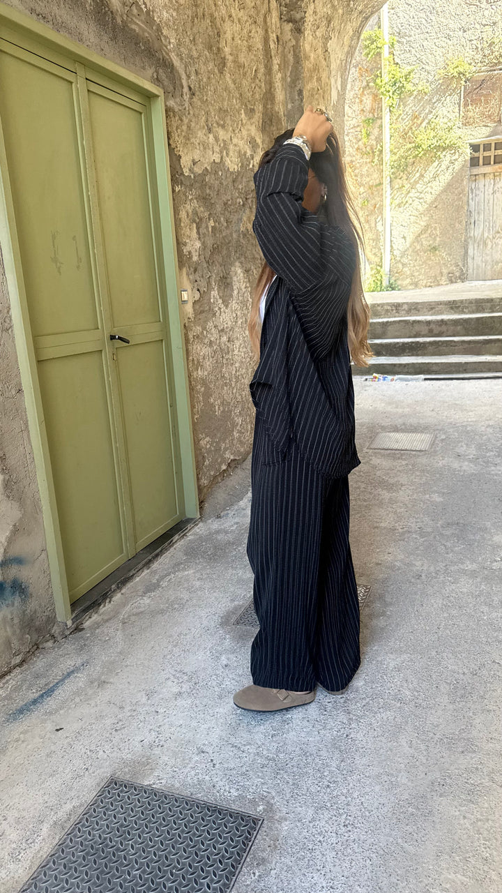 - Il pantalone ha l'elastico in vita ed è un modello palazzo
