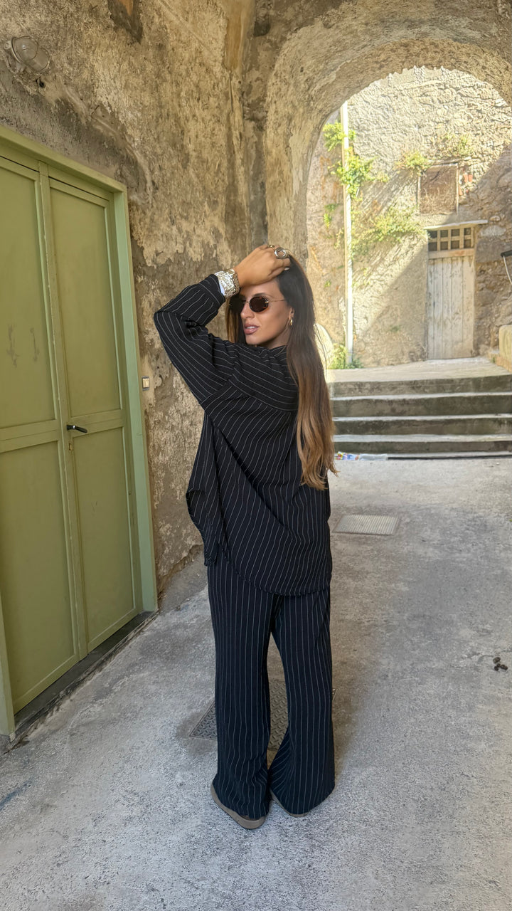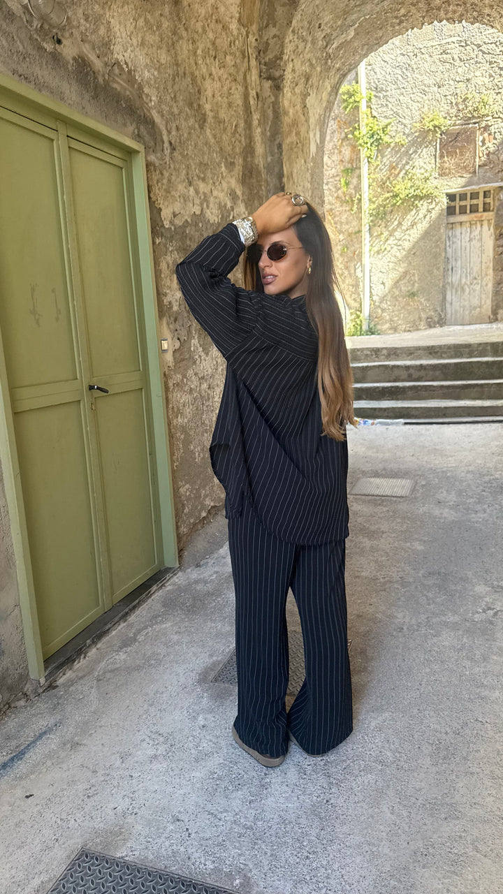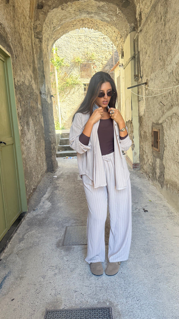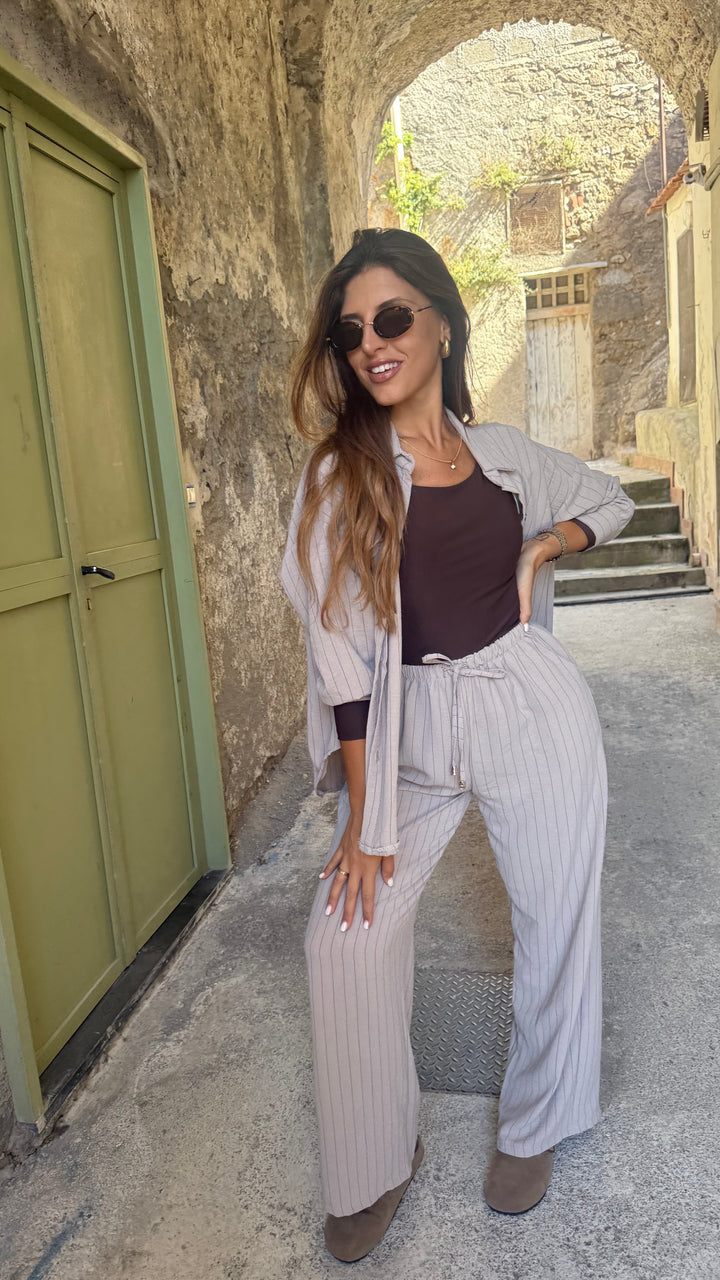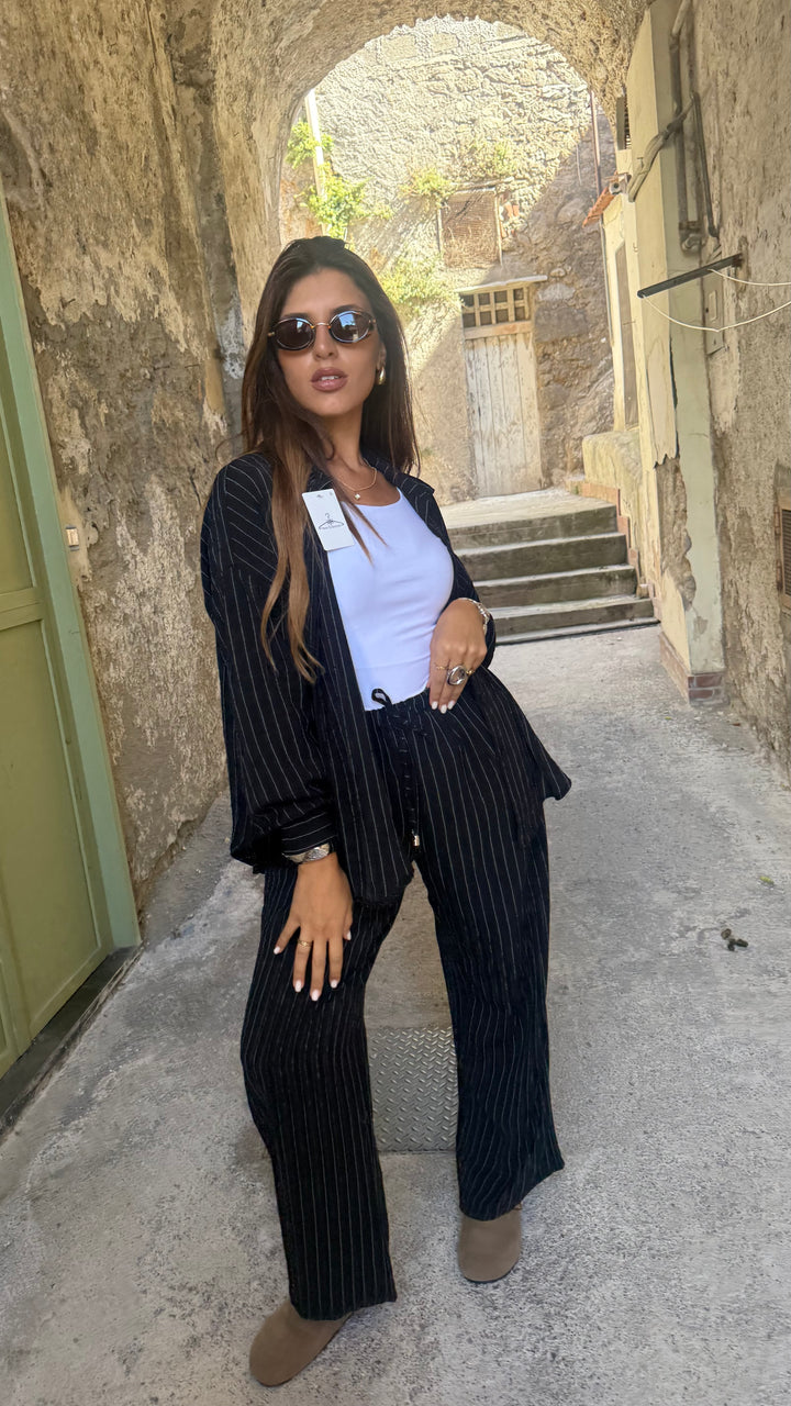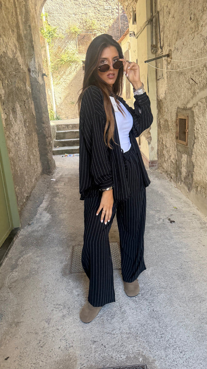- Il pantalone ha l'elastico in vita ed è un modello palazzo