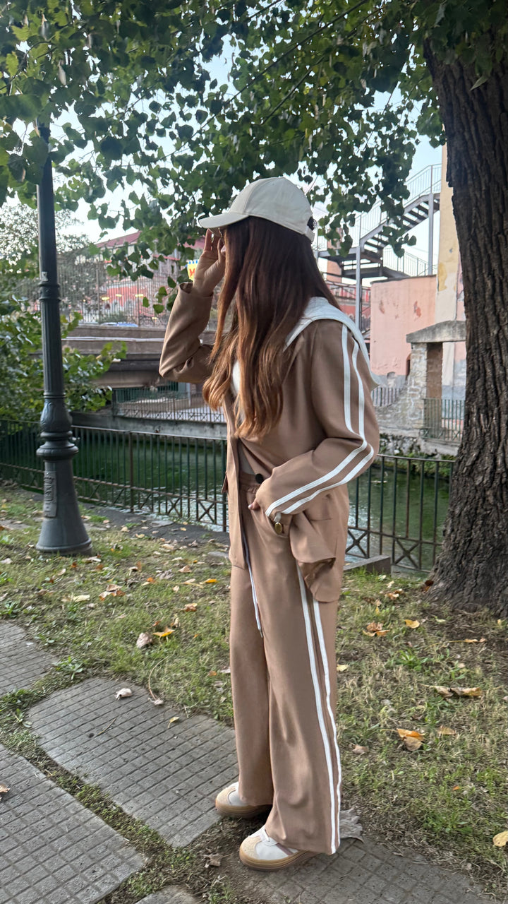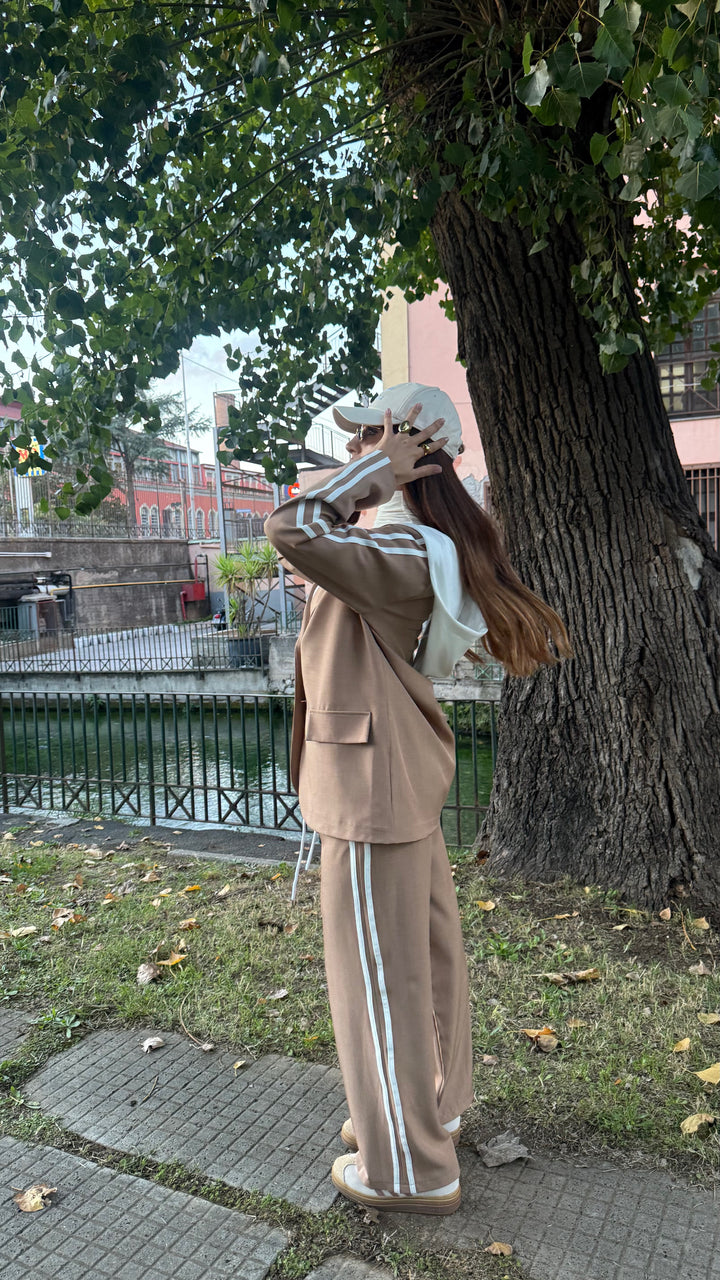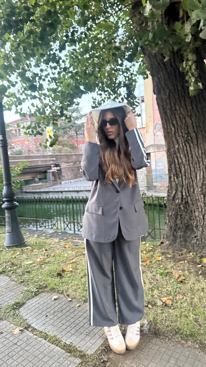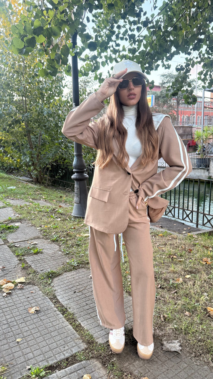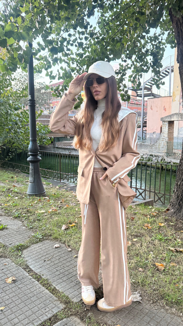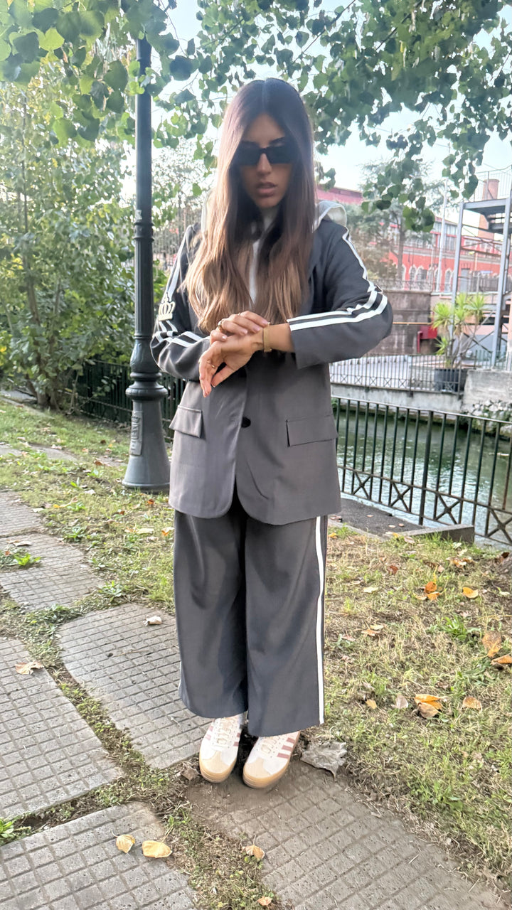 - Il pantalone ha l'elastico in vita ed è modello palazzo