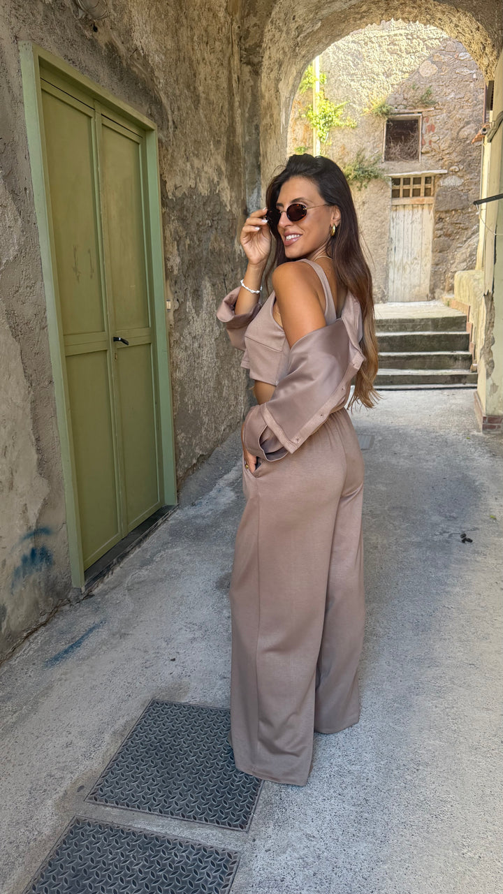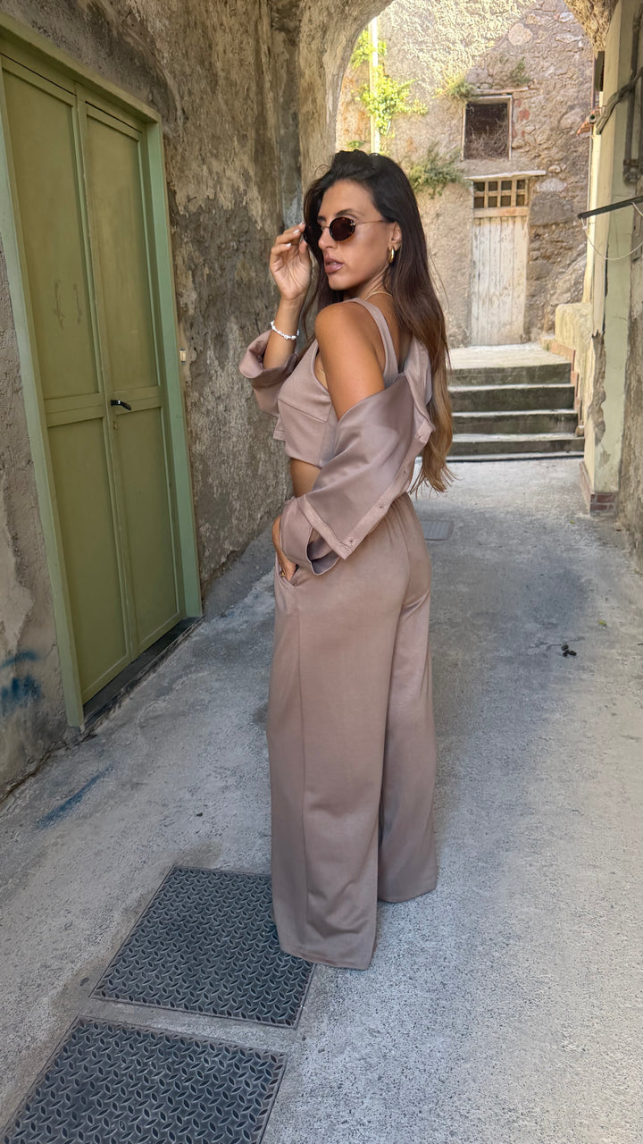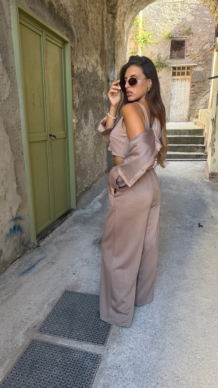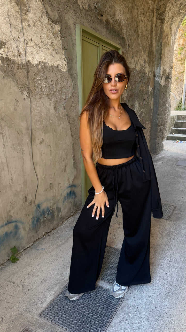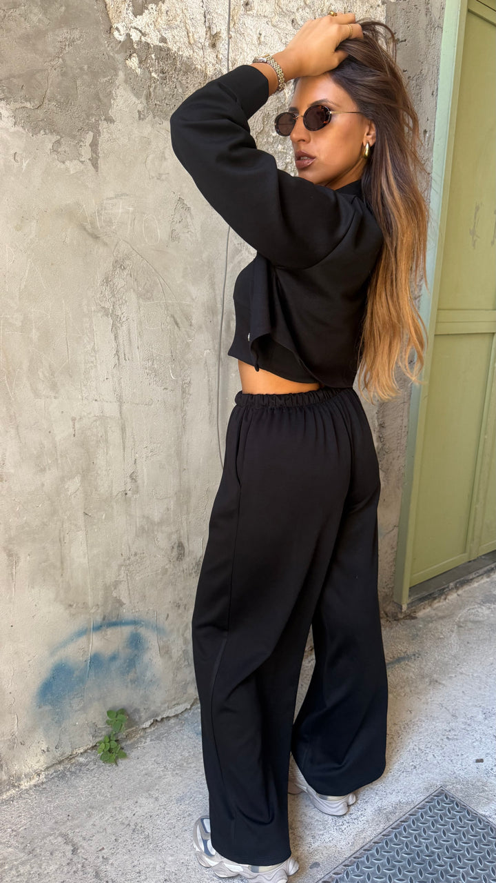 - Il pantalone ha l'elastico in vita ed è modello palazzo