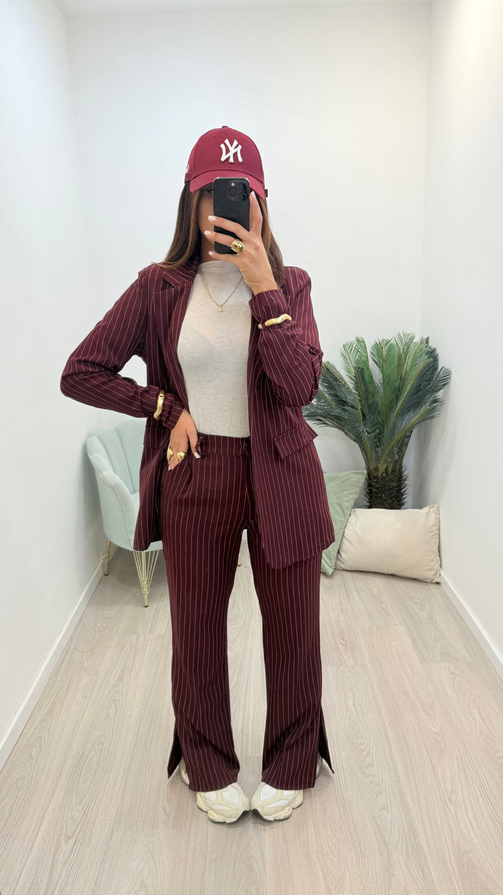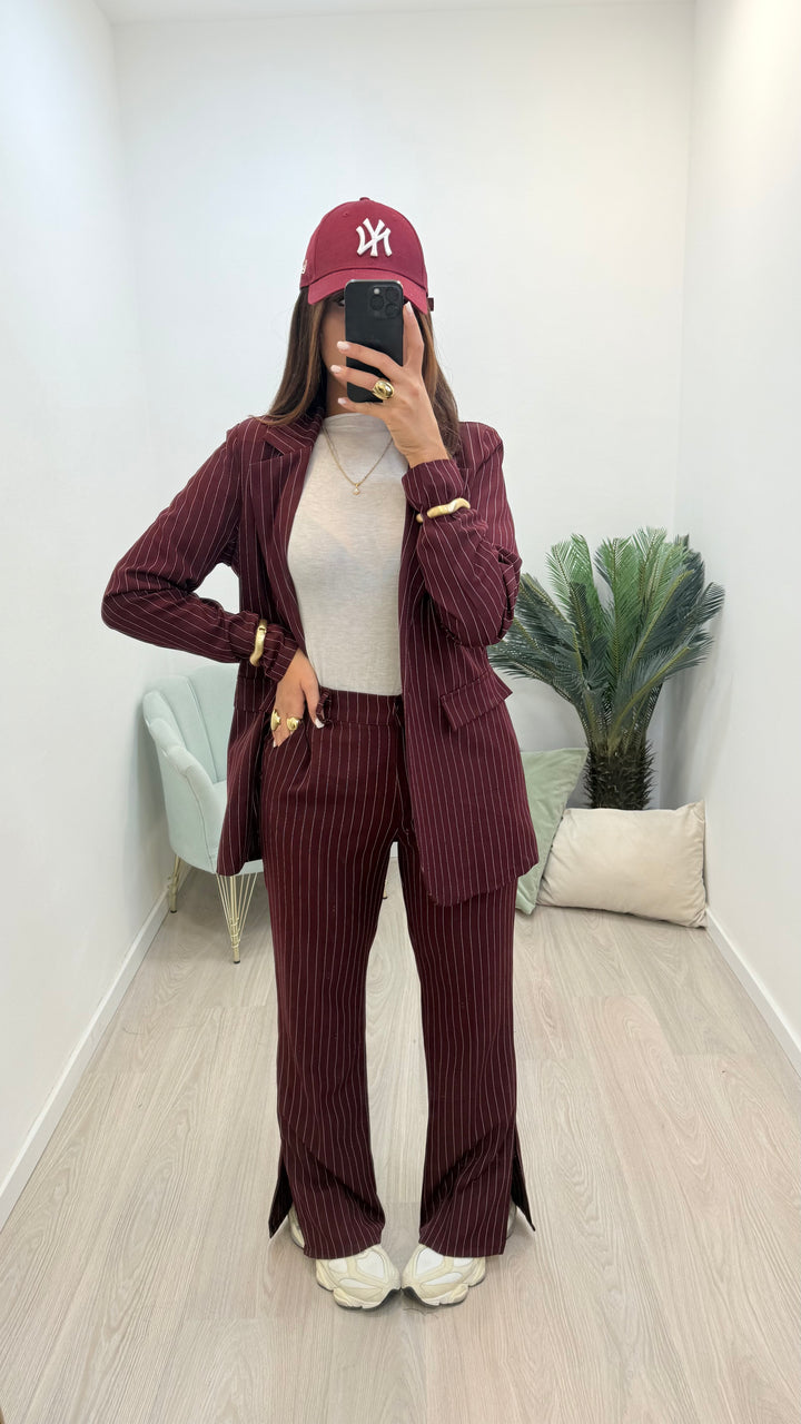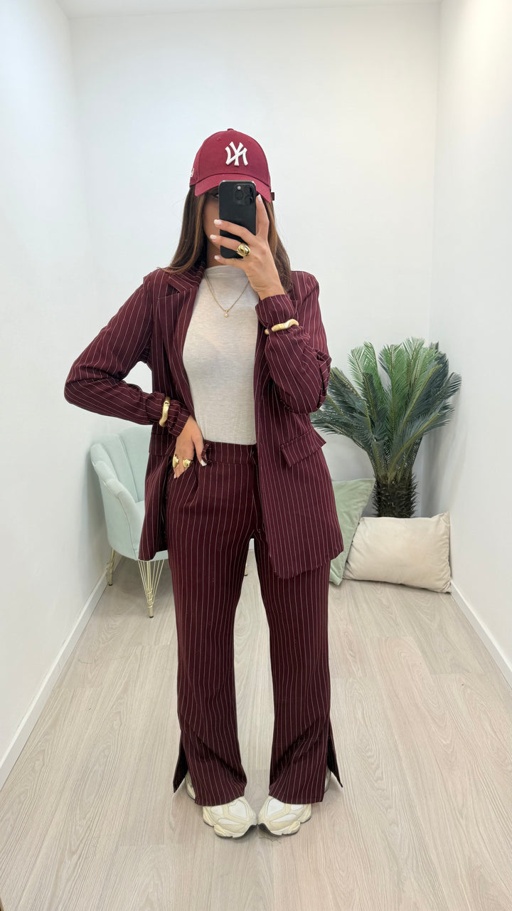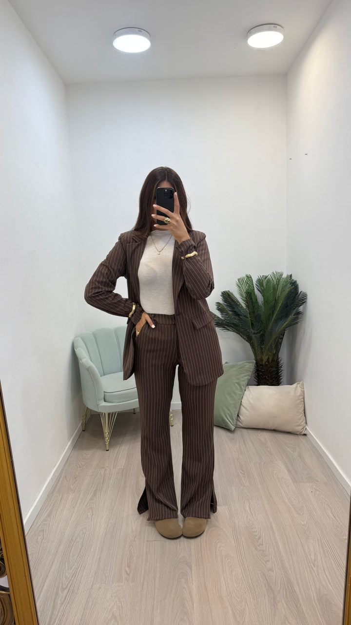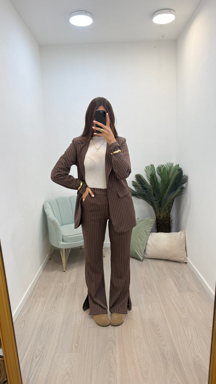 - Il pantalone ha l'elastico sul retro ed è modello palazzo con spacchetti ai lati